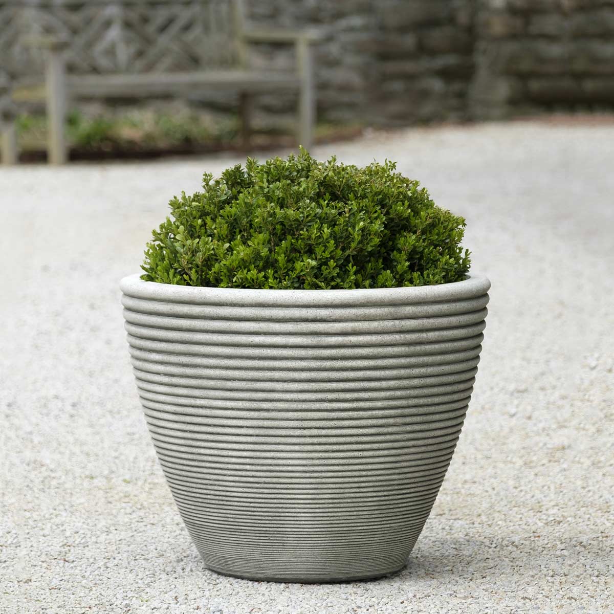 Available in four sizes, the Bibendum Planter series features a horizontal ribbing pattern for a distinct look. They are crafted from cast stone, in a variety of finish options, and create visual interest as a single container or differing height groupings.