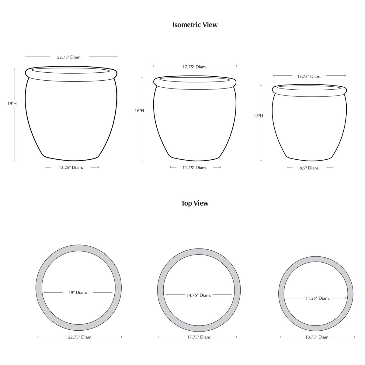 | Size | Set of 3 22.75"DIA. x 19"H | 71 lbs 17.75"DIA. x 16"H | 45 lbs 13.75"DIA. x 13"H | 24 lbs |