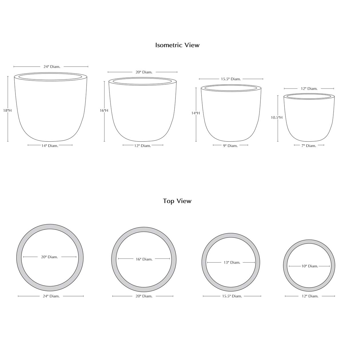 | Size | Set of 4 24″DIA x 18″H | 80 lbs 20″ DIA x 16″H | 56 lbs 15.5″ DIA x 14″H | 34 lbs 12″ DIA x 10.5″H | 18 lbs |
