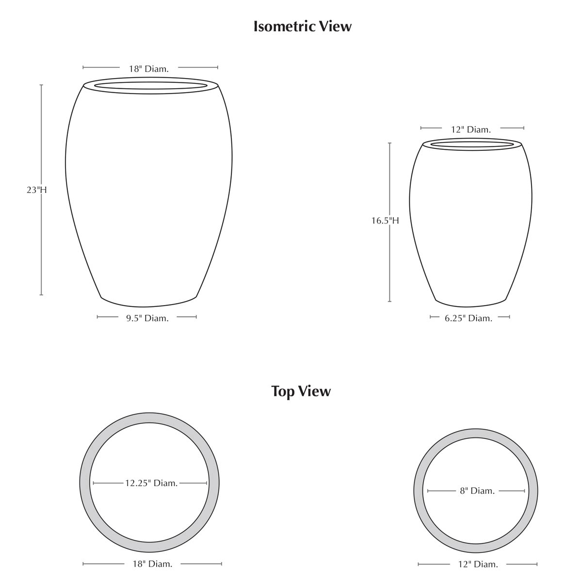 | Size | Set of 2 18″DIA x 23″H | 67 lbs 12″ DIA x 16.5″H | 28 lbs |