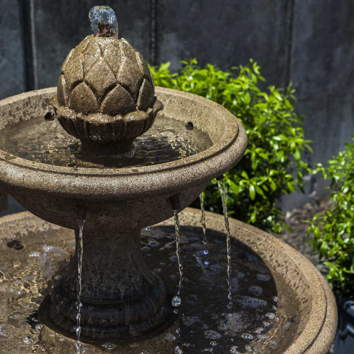 The La Mirande Fountain has multiple copper spout water exit points which means it will provide an interesting, pleasant sound. Made of cast stone, in the USA, it is available in 12 different patinas.