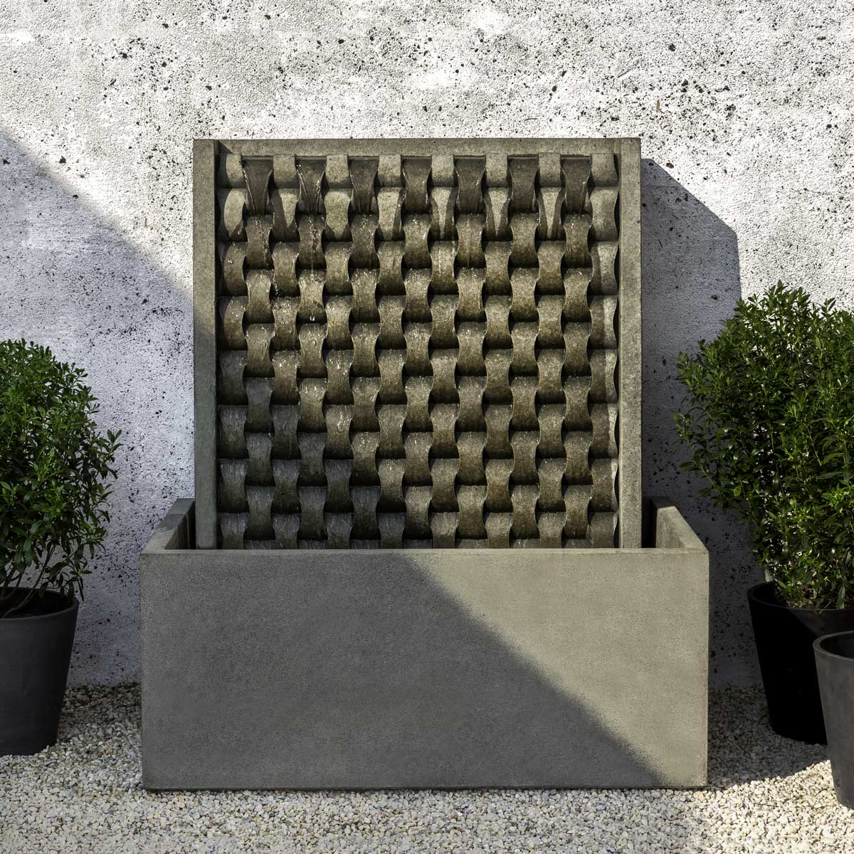 An intricate weave on the back panel adds visual interest and texture to our Large M Weave Fountain. This rectangular trough wall fountain comes in a selection of custom finishes to enhance your outdoor setting, style, and plantings. Also available in a smaller dimension, M Weave Fountain. This fountain holds approximately 20 gallons of water.