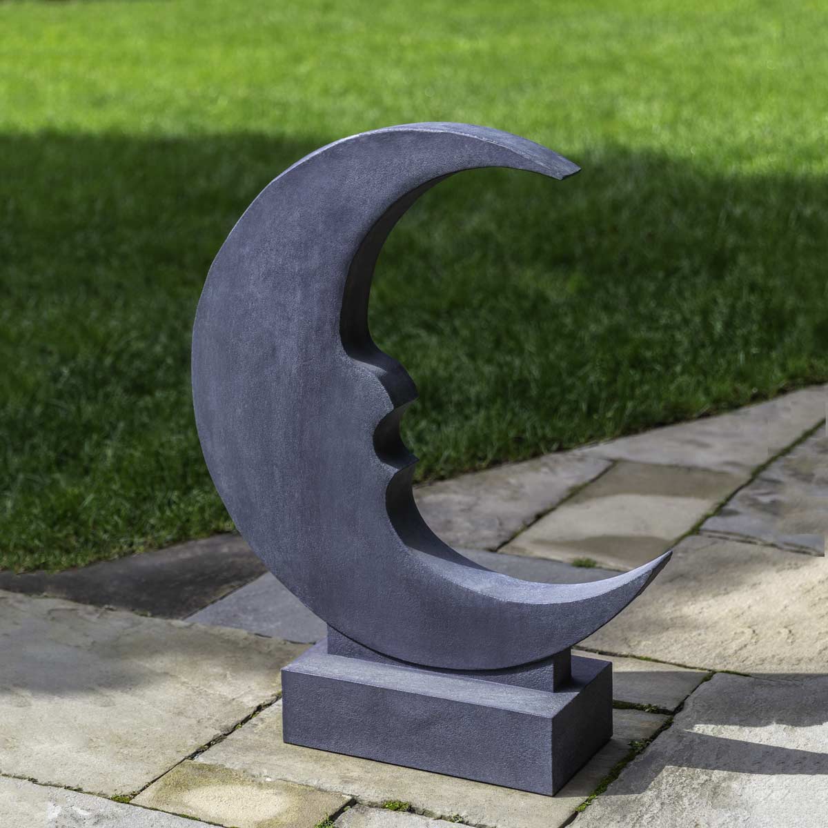 The charming Luna garden statue depicts the crescent moon in silhouette form. It is crafted from cast stone, in many finish options, and makes an artistic display when placed on a solid surface, table, or pedestal.