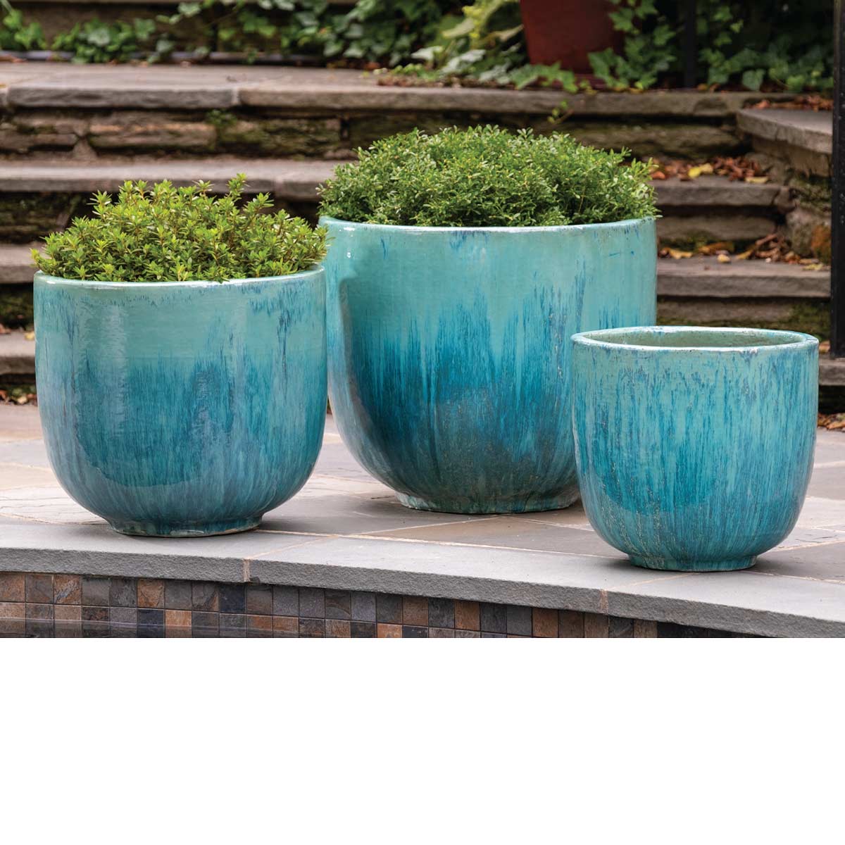 Use the set of three Mara Planters to bring a burst of color to your outdoor area. These terracotta containers have a glossy turquoise glaze and include a drainage hole in the base. Their broad bowl shape suits low shrubs or dense foliage.