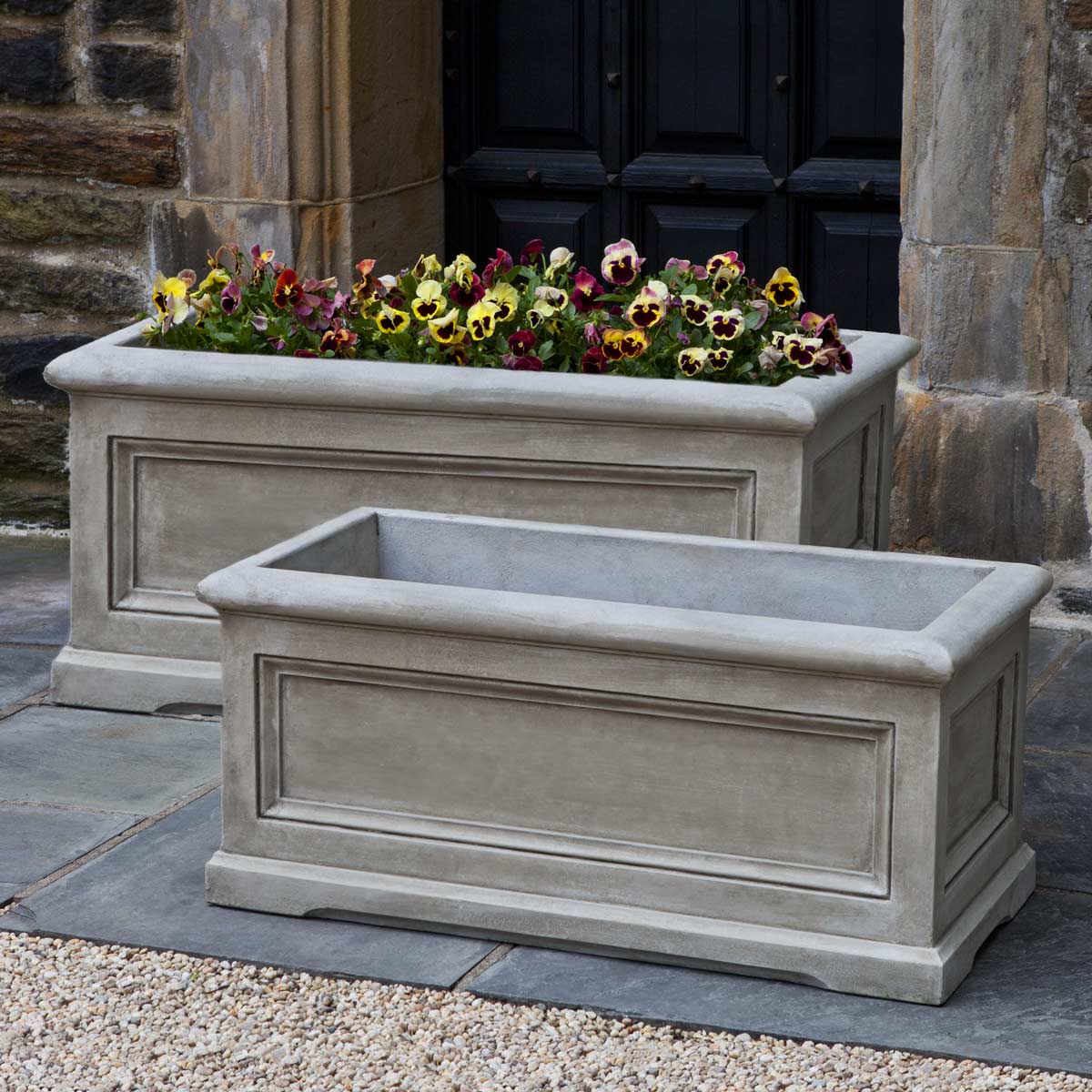 Available in two sizes as well as Square Planters, the Orleans Window Box Planters have a weathered-look patina that softens the look of the rectangular design. They are crafted from cast stone, in a variety of finish options, and can be used to punctuate an entry path or to define outdoor areas. *As shown in Alpine Stone Finish