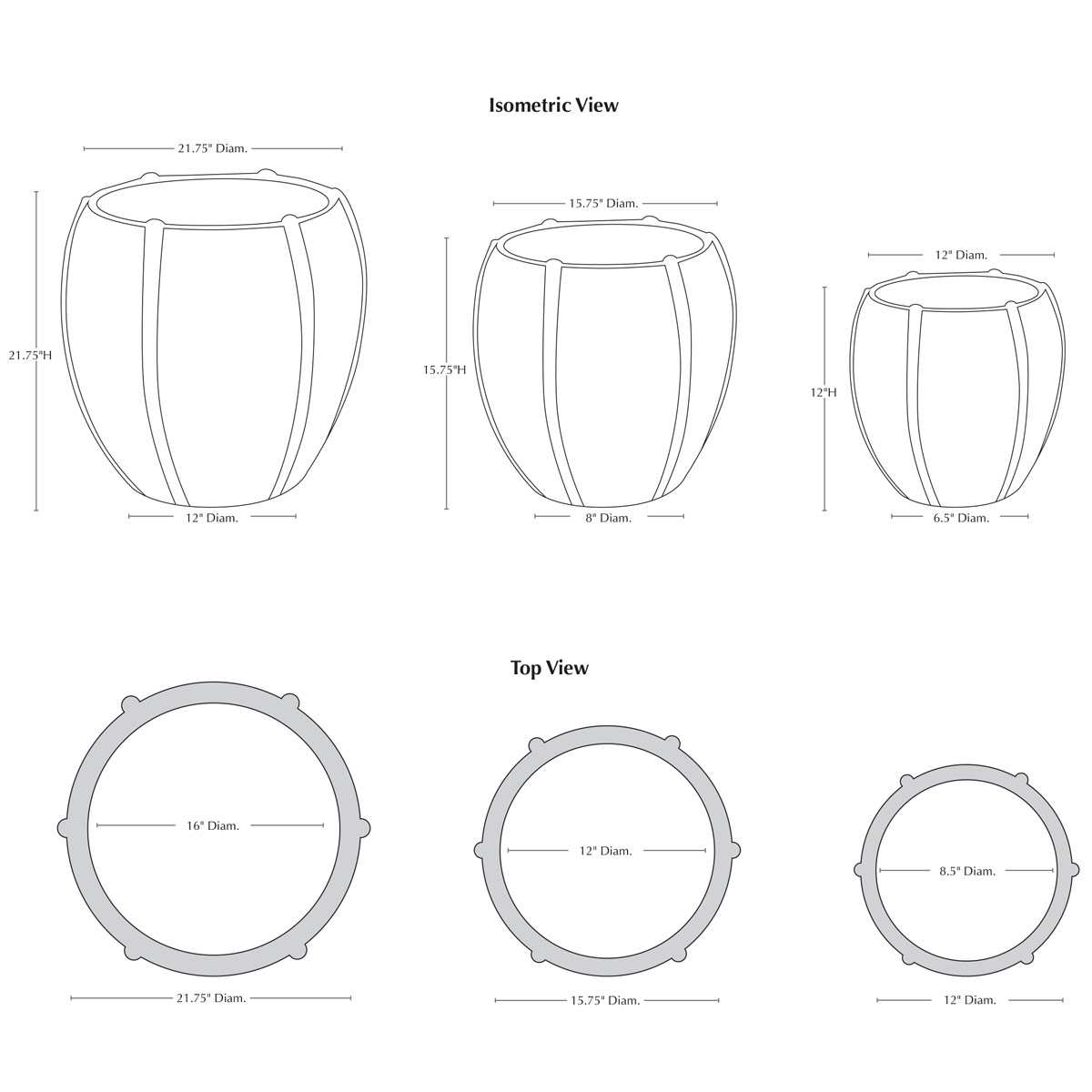 | Size | Set of 3 21.75"DIA. x 21.75″H | 65 lbs 15.75"DIA x 15.75″H | 28 lbs 12"DIA. x 12"H | 16 lbs |
