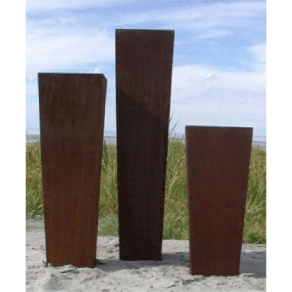 Most cataloged sizes are made of 14 gauge steel, and 11 gauge aluminum. Custom items are engineered to use the appropriate material, and shop drawings will be provided prior to fabrication. Corten and Mild Steel products are preweathered, and arrive with a surface coat of rust on them. Aluminum will not rust, and the powder coated finish has a 3 year limited warranty. Both Steel and Aluminum fabricated products have a 5 year warranty on their structure.