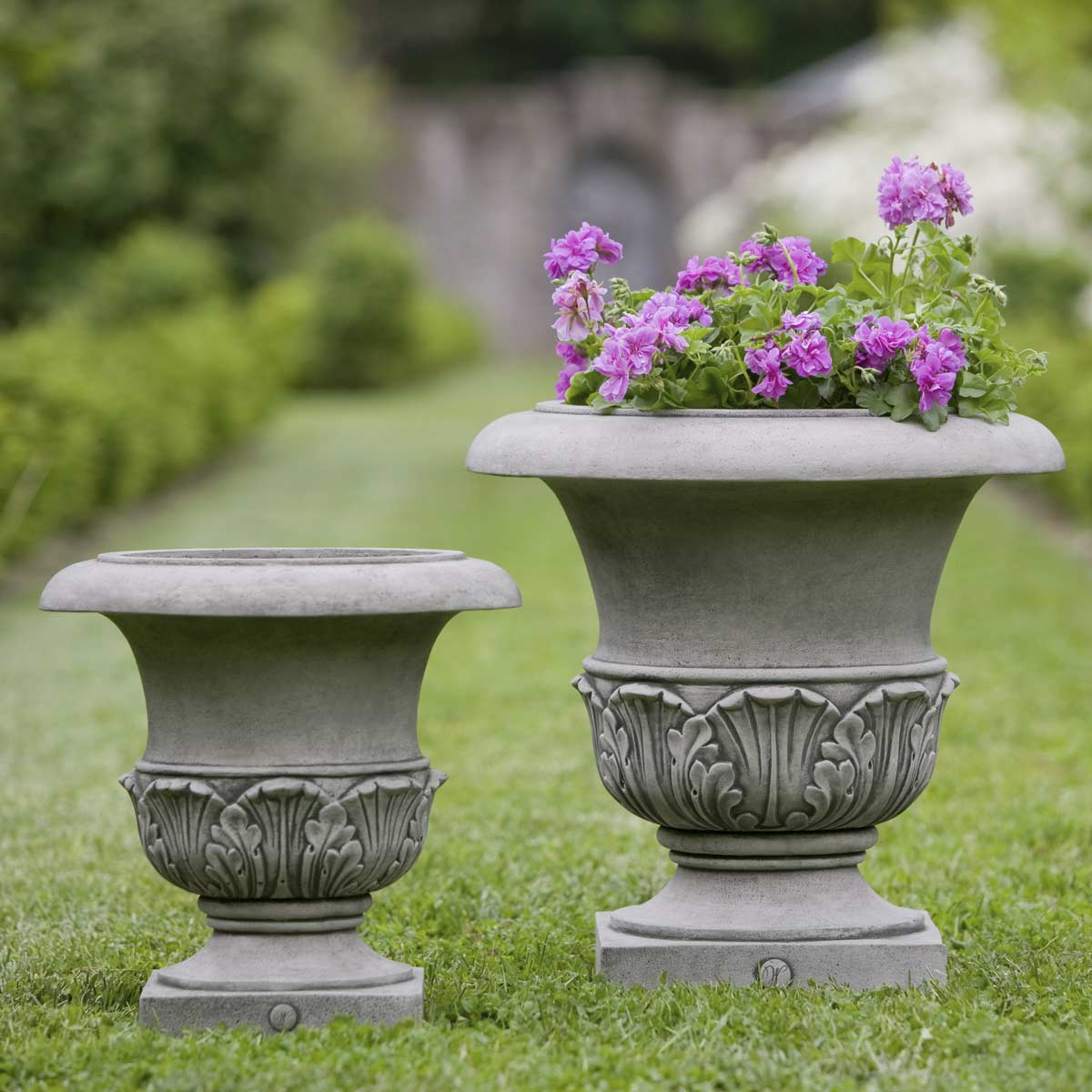 The Williamsburg Acanthus Planters come in two sizes, with a distinctive leaf motif dating back to the ancient Grecian era that symbolizes immortality and resurrection. Its elegant urn shape is crafted from cast stone, in a variety of finish options, and is suitable for shallow to deeper rooting plantings. Part of the Williamsburg collection, these 18th-century inspired pieces offer a refined, yet contemporary, aesthetic. *As shown in Alpine Stone Finish