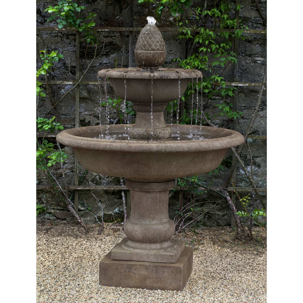 Our grand Wiltshire Fountain showcases a classical two-tier pedestal design and makes a lovely centerpiece in contemporary patio or garden environments. Water spouts from the top, cone-shape finial into the two round basins below and creates a tranquil sound effect.